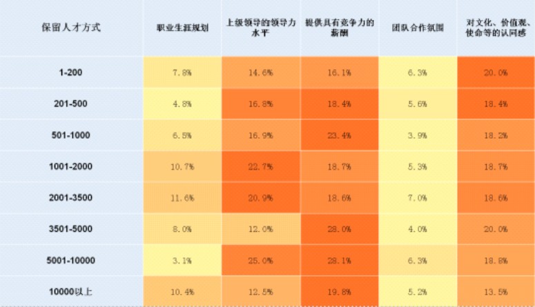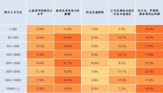 调查发现,20.8%的人认为“对文化、价值观、使命等的认同感”是企业吸引人才的首要方式,换言之,提供一份有前景的事业远比提供一份高额的薪水更吸引人才。当然,“提供具有竞争力的薪酬”紧随其后,为16.1%。这一现象让“具备竞争力的薪酬”更像一个保健因素,而非激励因素。而另外一个因素“上级领导的领导水平”则让我们看到了对于关键人才管理与普通员工管理的一个明显的差异点,由于这类人才的特殊性,人员的管理需要领导者具有充分驾驭人才的能力,给予关键人才必要的关心与指导,以及充分的授权,让关键人才能够有足够的空间充分发挥自身才能。这些成为吸引人才的重要因素。