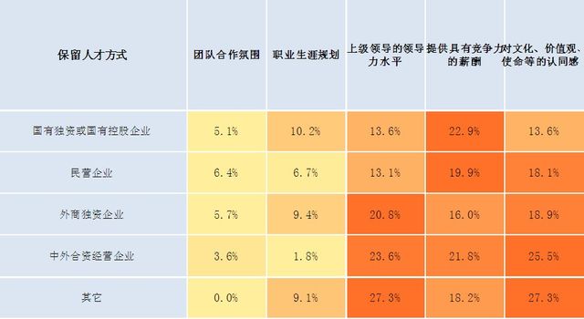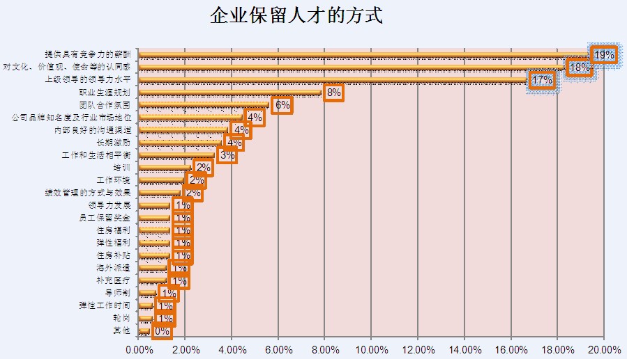 而在企业保留人才的方式选择上,作为首选的却是“物质留人”。选择“提供具有竞争力的薪酬”的比例为19.32%,比“对文化、价值观、使命等的认同”略微高出约1%的比例。这也体现出,在关键人才的保留上,企业会“物质留人”与“事业留人”并重,作为最重要的两大因素。有趣的是,如果我们把排在第三位的“上级领导的领导力水平”作为“情感留人”的话,那么,企业在这三种方式选择上的排序将呈现:物质留人—事业留人—情感留人。