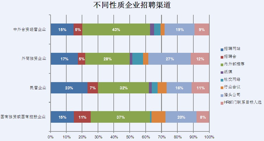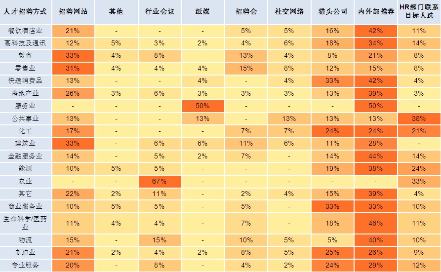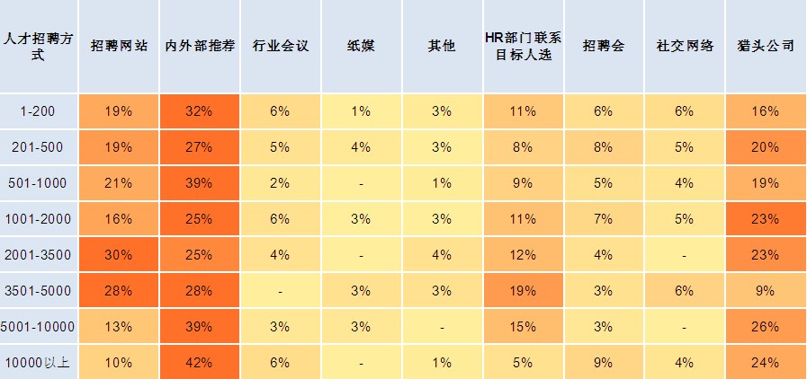 从不同企业规模对于招聘渠道的选择来看,并未产生明显差异。但在2001-5000规模的企业中,可以清晰的看到,由于企业规模的膨胀,招聘渠道的选择会呈现出多样化,除了内外部推荐外,招聘网站的使用,HR直接联系目标人选,猎头公司的使用等方式比例有所提高。
