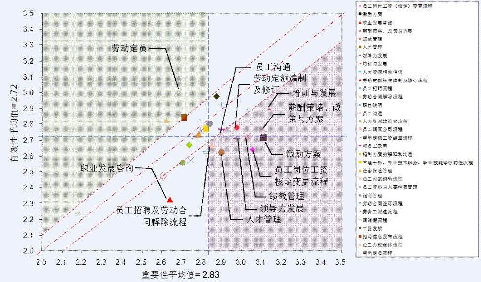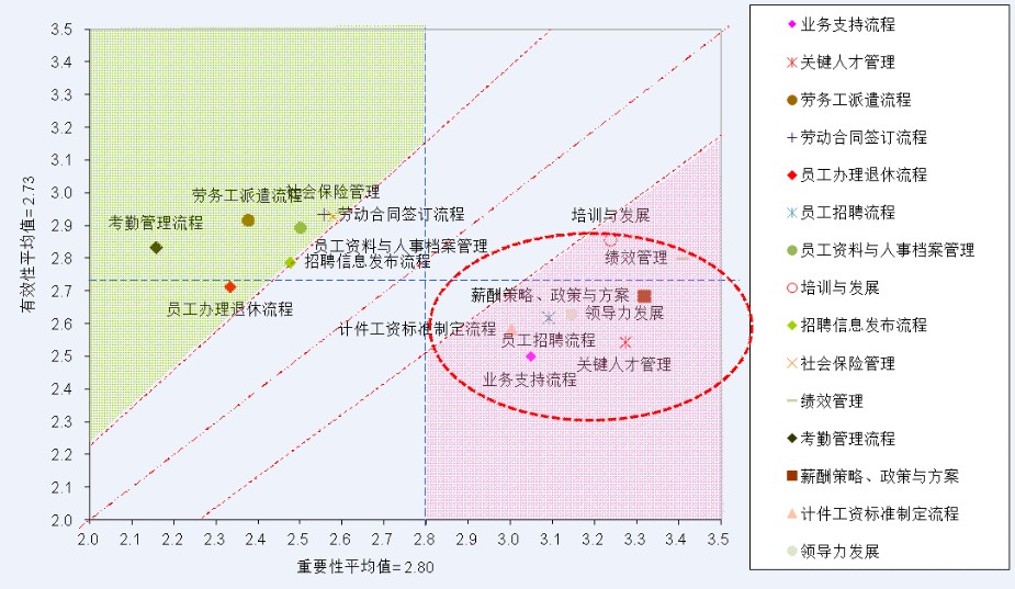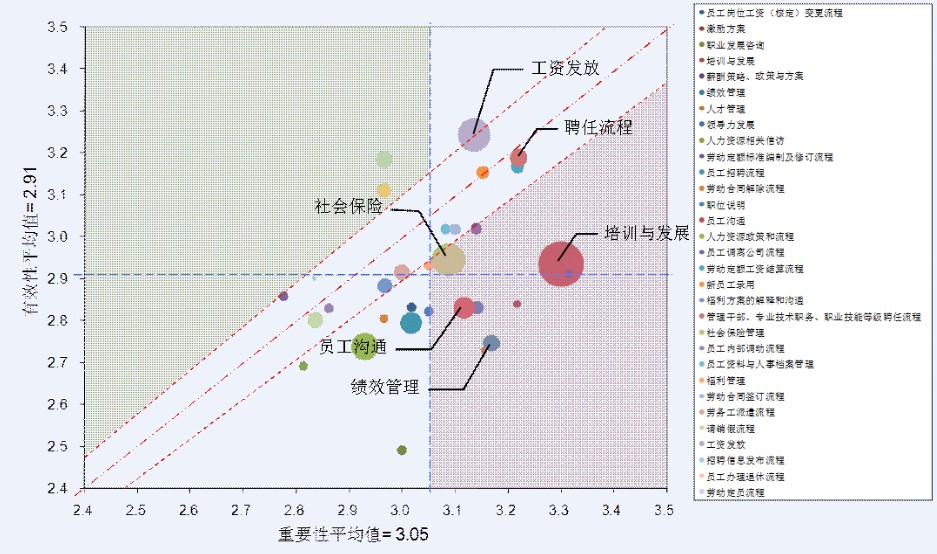 从成本角度分析,在对该A企业的人力资源工作投入的分析中(图中气泡大小代表在该工作投入的多少),可以看出客户其实在培训发展、绩效管理等方面已经投入较多的精力,但实际的效果并不理想。