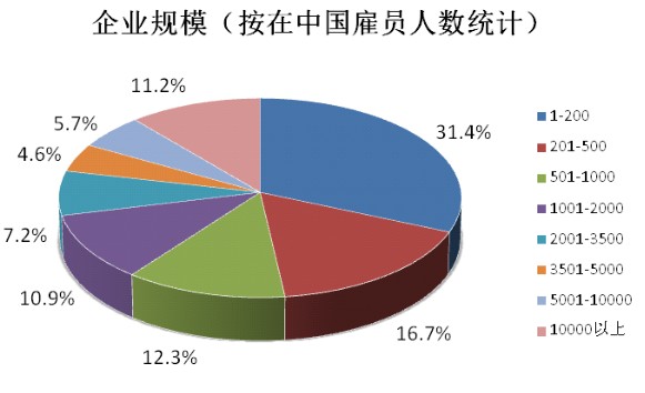 行业:参与调研的企业,涉及制造业、高科技及通讯、专业服务等20多个类型,其中中国的传统强项制造业,和高科技及通讯、专业服务行业、金融服务业相对占比较大。