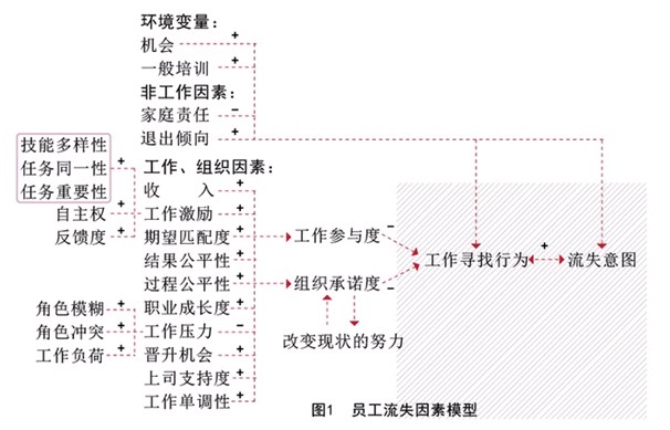 造成员工流失的原因多种多样,不同行业的各类专家都曾经就这个问题进行过调研,也提出了自己应对员工流失问题的策略和见解,为企业留人出谋划策。从心理动因的角度来分析员工流失的问题,可以得出如下的一个综合的模型,如下图1。