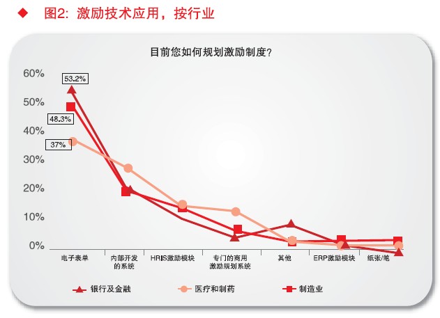 在我们的调查中,最依赖于电子表格的行业是制造业,其激励规划使用电子表格的比率为52.2%,其次是医疗和制药行业 (48.3%)。银行和金融行业使用电子表格的比率最低,但仍然达到了37%。(图2)