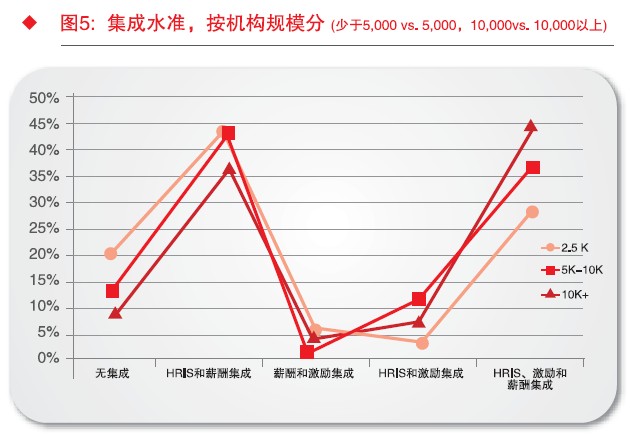 毫无意外的是,机构越大越有可能是集成了所有三个系统(HRIS、薪酬和激励)。根据图4,对于拥有1,000名及以上员工的企业,37.9%的具备集成的薪酬、激励和HRIS系统。与之对比的是,对于1,000名以下员工的企业,30.8%的具备集成的系统。同样,员工人数少于5,000名,在5,000-10,000名之间,以及超过10,000名员工的企业,明显更趋向于具备集成的系统(图5)。(请注意,对于20,000名及以上员工的企业 [图4或5中未显示] ,近一半约49.1%的拥有集成的HRIS、激励和薪酬系统。)