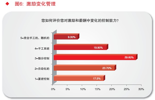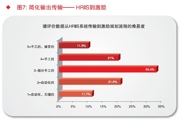 ※ 不少机构(近1/3) 在将数据从其激励规划流程传输到薪酬系统时有困难。约1/3的认为其在财年中控制激励管理和薪酬变化的能力是非常松散的或完全随机的。更多(约34%)的报告能够将数据从其HRIS转移到激励规划流程,但是仍然完全基于手工的流程,本组超过1/3的人将该流程描述为“痛苦”。