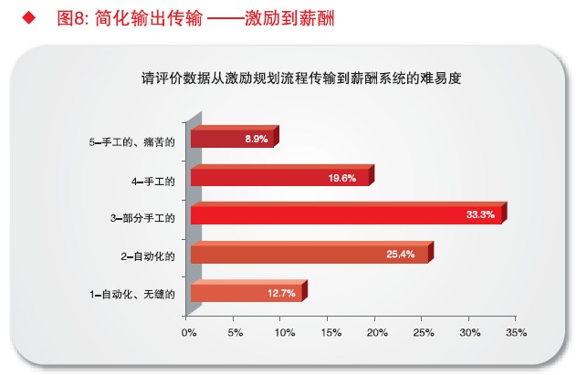 同样,数据从激励规划流程传输到薪酬系统对于不少企业也具有挑战性——不过这比从HRIS到激励系统好些(图8),这表明从激励到薪酬的集成度要高些。数据复杂性和数据量从集成的HRIS到激励系统比激励和薪酬系统之间典型传输的数据显著加大。这无疑从某种程度上解释了本调查揭露的集成比率差异现状。