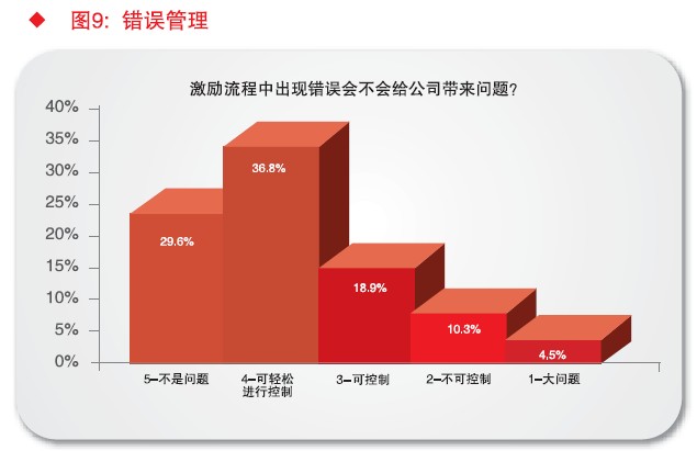 考虑到许多企业难以控制其激励流程,有趣的是,66.4%的受访机构发现错误都不是问题,或至少易于管理。不过这也表明,仍然有1/3的受访机构视错误管理为挑战。事实上,15%的受访者认为这可以是一个大问题或不可控的问题(图9)。