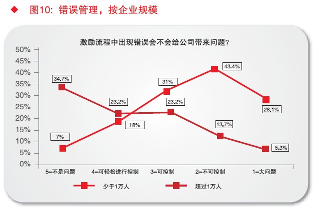 ※ 毫不意外,鉴于上述结果,本调查中15%的受访者认为错误是一个问题或非常严重的问题。更有意义的是,本调查中61.5%的中小型机构(员工人数少于1,000名)认为错误不能得到有效管理,或者是一个严重的问题,与之对应的是员工人数超过1,000名的机构仅为19% (图10),而员工人数为20,000名及以上的机构为14.5%。这表明,由于大型机构比小型机构更多使用自动化的HRIS/激励管理系统,所以同本调查中的小型机构比较,大型机构能获得更高水准的流程,能简化使用,提高精确性。目前小型机构大部分还依赖于手工系统。