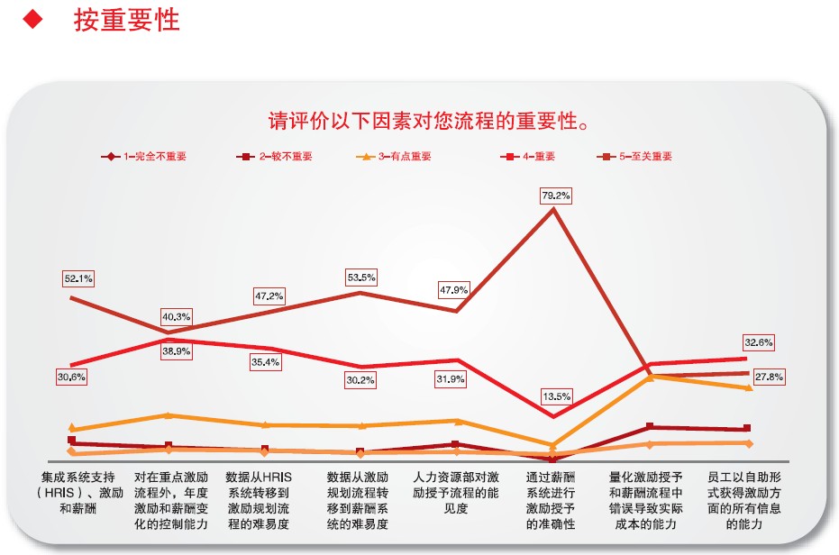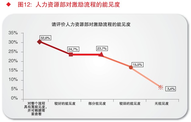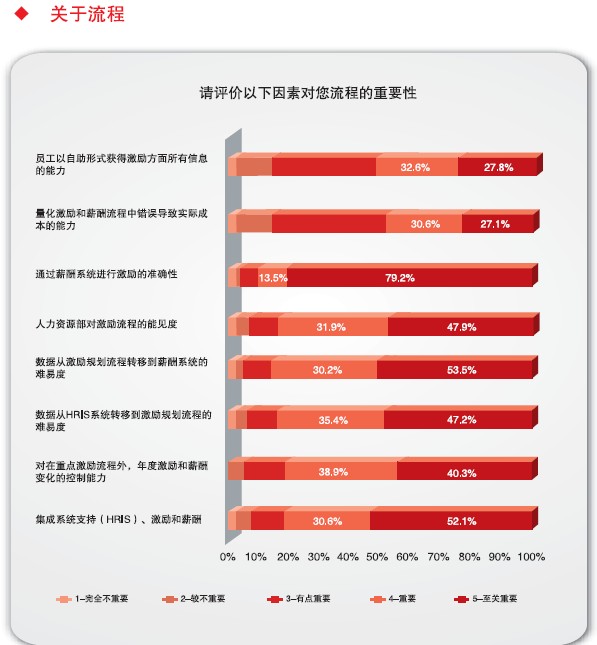 ※ 公司在为高度重要项目提供支持上有着明显不足。83%的受访者视人力资源-薪酬-激励集成是关键的或高度重要的,然而仅有35.5%的受访者认为具备完全的集成。此外,92.9%的受访者表示,通过薪酬系统实施激励制度的精确性是关键的或高度重要的,只有17.8%的受访者认为他们对整年度的激励决策有着紧密的控制。少于1/3 (32.7%) 的受访者表示,其整个激励流程具有可视性。