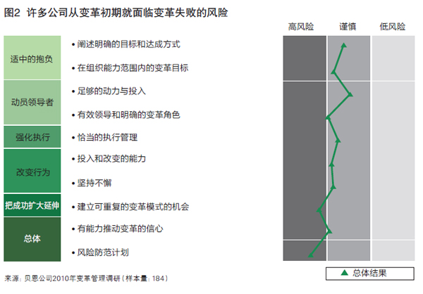 每个变革方案都有它独特的风险种类与程度。贝恩顾问公司找出三十种可能破坏变革行动的潜在风险,例如倡导与支持的不足、变革负荷过重。这些风险往往会在整个变革过程中以可预测的型态发生。但在每个阶段,只有几项风险会决定变革行动的成败。例如,在变革行动的开始阶段,若负责倡导与支持的高阶主管,未能清楚评估组织的实现变革能力,他们就无法作出好决策,把变革推动至下一阶。