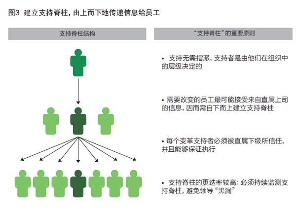 “变革瀑布”(change cascade)是这种支持脊柱的应用之一:在每个组织层级,从最资深的人员开始,管理阶层召开会议,说明领导者如何达成他们的决定,并征询意见。每个层级的变革支持者主持会议,说明变革方案,并征询意见回馈。由于这是在整个企业实行,因此务必触及每一位组织成员。每一个人都直接从即将担任其变革支持者的人(通常是他们的直属上司)那儿听到这些变革信息。
