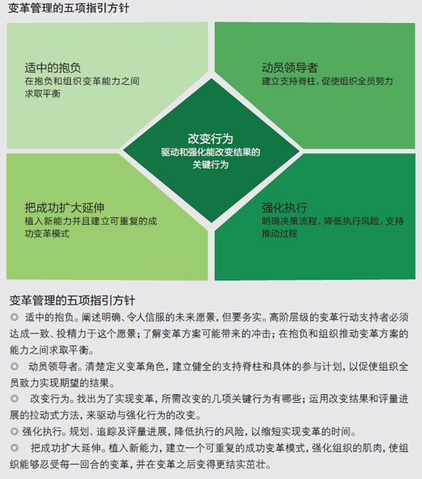 变革需要时间、聚焦、决心和规划。不过,纵使有最佳意图,在变革过程中,情况仍然可能偏离轨道。变革要成功,必须促使人们确实改变行为,这需要勇气与纪律。任何购买健身器材回家的人都知道,把器材安装摆设好了,并不代表健美效果就会自然实现。