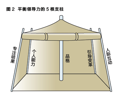 平衡领导力的五根支柱 设想一个帐篷,中心和四周都立有支柱撑起帆布。帐篷中心的空间代表了领导者的领导有效性。我们通过实证研究揭示的16 项区别性素质就分布在“帐篷”的五个区域。如图2 所示:中心支柱所代表的领导特质与诚实、正直密切相关,该特质是领导力有效性的核心。在过去几年内,各种各样的事件已充分证明当领导者缺乏这些品质时,公司将会付出多么严重的代价。一些著名企业因为少数关键人物的所作所为而声誉扫地。