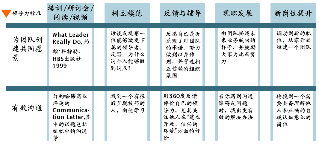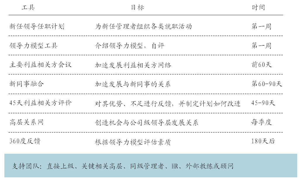 美国银行新任高管的转型则由一系列的学习活动构成。每年被提升到250名核心高管队伍之一的新任管理者都会在履新时收到一份上任计划。其中会详细列出如何成功地完成第一年工作的路线图,包括哪些是要重点发展的关系,哪些信息需要快速掌握,工作的主要目标是什么,如何发展自我,以及在不同阶段其他利益相关者对他的期望等。这些学习资源和工具已经被证明非常有价值。诺华制药为塑造具备组织能力的经理人,专门设计领导力发展计划工具(Leadership Standard Development Planner),针对每一项领导力素质,提供了完整的5类培养方式和建议,并提供丰富的学习资源库。