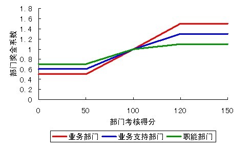 首先将企业中的所有部门分为业务部门、业务支持部门和职能部门三类。然后,针对这三类部门,设置变化幅度不同的P值。原则是:对企业业绩直接影响越大,P值变化幅度越大;100分之上的P值变动斜率应大于100分之下(见图1和表4)。