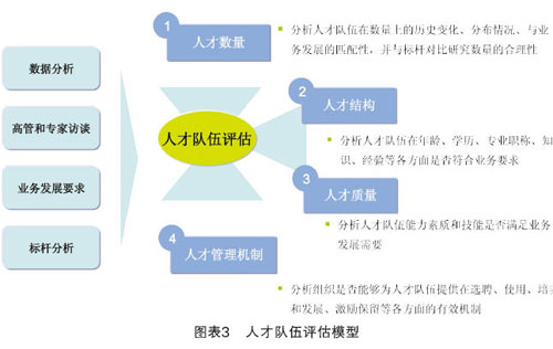 关键人才队伍能否支撑企业业务战略目标的实现呢?这就需要对关键人才队伍进行全面系统的评估,包括对人才队伍数量、结构、质量以及人才管理机制等与业务发展战略的匹配性进行评估(见图表3)。