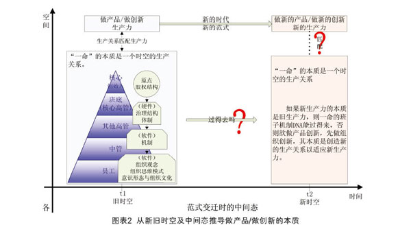 一个企业在一定时期内产生或被创立的原因,主要是为了适应当时的生产力发展需求,如比尔·盖茨在1975年PC革命时创立微软,就是创建了适合PC革命的一整套生产关系(见图表2时间轴t1部分)。然后,世易时移,如果此时新的时代、新的范式产生(见图表2时间轴t2部分),如1995年的互联网革命,将会出现什么情况?