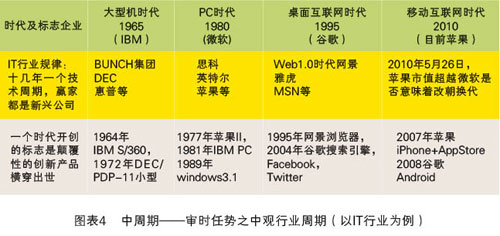中周期以IT行业为例,规律是每15年左右一个行业周期,即1950年行业起步,1965年大机器时代,1980年PC革命,1995年互联网革命,2010年移动互联网革命。每个周期的赢家都是新兴公司,老牌企业开始没落,而一个时代开创的标志就是两三款颠覆性创新产品横空出世(见图表4)。