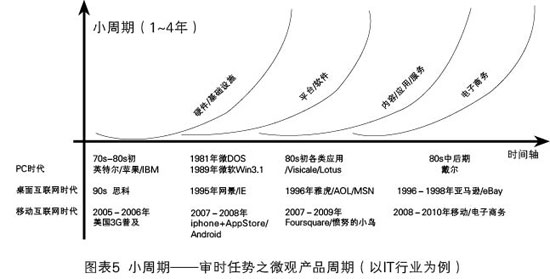 小周期的产品周期是1~4年一波。正所谓,IT行业四时春,卢橘杨梅次第新:先是硬件和基础设施,然后是平台级软件,再后是内容、服务、应用,最后电子商务,四波历时约15年,一个时代尘埃落定,这一轮的创新就被固化在人类生活方式之中。以桌面互联网为例,硬件思科、平台网景、内容雅虎、电商亚马逊。以移动互联网为例,基础设施3G,平台iPhone+AppStore,应用服务愤怒的小鸟等,移动商务断后(见图表5)。