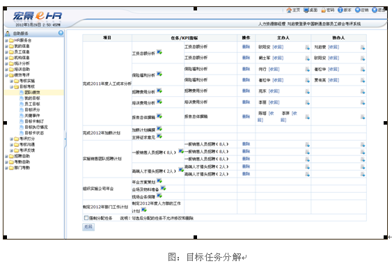 从直线经理来看,各级管理者可通过自助平台设定下属员工的目标任务,或修改员工制订的目标任务——当然,这取决于企业目标管理的具体程序;在过程中及时了解下属员工目标完成情况,从而有针对性地对员工进行沟通和辅导,确保员工目标和部门目标的完成。