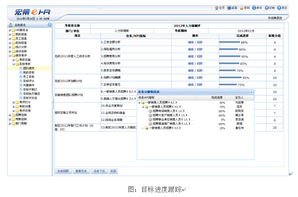 在大量客户需求与实践的基础上,这一问题得到解决。在宏景e-HR系统中,目标的层层分解过程清晰地展现出来,各层次目标、任务之间的关联关系、责任人、完成状况一目了然,清晰、及时地了解战略目标在各个部门的完成情况,随时监控目标的执行情况,发现偏差及时纠正。