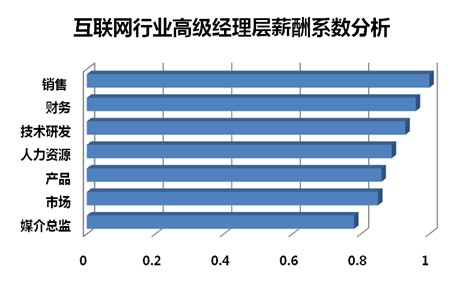 与大多数行业一样,互联网行业销售部门的平均工资排名前列。随着商业模式的不断探索和完善,企业销售量和市场覆盖面都成倍增加,销售部门的平均工资也水涨船高;由于互联网公司与国内外风险投资者有着密切的联系,能制定公司财务战略和洽谈融资事务的财务总监在人才市场一直是稀缺人才,所以企业纷纷加大了财务部门的人力成本,以互联网销售总监薪酬水平为基数,财务总监薪酬系数为0.96;技术研发在高科技行业是核心关键部门,互联网行业更是因为对该岗位有创新素质高和把握行业发展趋势能力强的要求,对技术研发部门更为重视,据众达朴信调研数据显示,技术总监薪酬系数为0.93;互联网行业对人力资源管理的重视程度相对较高,对人力资源管理者的素质和任职资格要求也很高,薪酬水平相对较高,薪酬系数为0.89。此外,产品总监、市场总监和媒介总监也是互联网行业的关键核心岗位,薪酬系数分别为0.86、0.85和0.78。