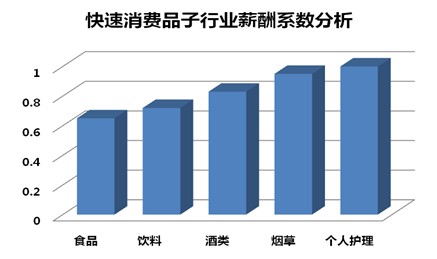 个人护理行业多以外资企业为主,所以薪酬水平较高,以个人护理行业薪酬水平为基准,可以看见快速消费品各个子行业的薪酬状况。烟草行业属于高利润行业,企业在岗员工薪酬水平较高,薪酬系数为0.95;酒类行业薪酬增长较快,薪酬系数为0.83,酒类细分行业中,高端白酒行业薪酬水平竞争优势大,啤酒、葡萄酒紧接其后;饮料和食品行业薪酬水平较化妆品、烟酒等领先行业相比有一定差距,薪酬系数分别为0.72和0.65。