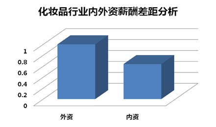 以化妆品为代表的个人护理行业,中小型企业虽然占企业总数的90%,市场份额却不到20%,外资/合资企业占主导地位。根据众达朴信调研数据显示,行业内外资薪酬差距明显,以外资化妆品行业薪酬水平为基数,内资企业薪酬系数仅为0.64。随着层级的增加,薪酬相对差距越大。