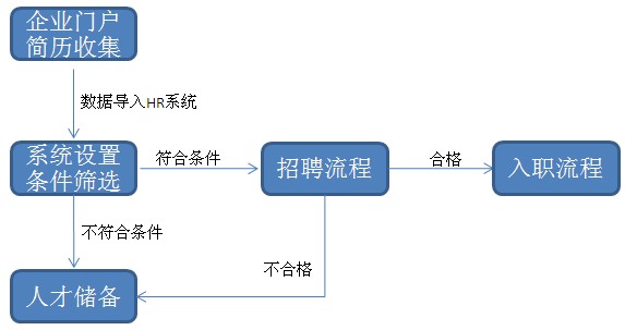 2、所有入离职人员申请流程进行逐级审批,同时按照月、周、日、时来设置转正、合同等到期提醒,通过系统、邮件、短信发送消息。3、所有人员异动信息,包括员工调动、员工转正、员工调薪等与OA进行无缝接口,方便修改数据同步更新。4、与中天证券门户网站进行对接,将网站上接收到的简历导入到系统中通过设置条件筛选将符合需求的简历自动存档留作人才储备,经面试合格后自动转到入职流程。见下图。