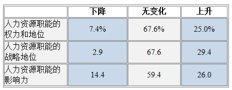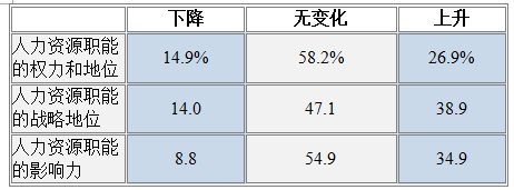 调查结果显示大多数企业的人力资源部门都发挥了积极的作用。人力资源管理人员被问及,在应对经济衰退过程中,他们公司的人力资源职能发生如何改变。只有极小比例的公司表示经济衰退导致了人力资源职能战略地位,权力和影响力的下降。在大多数公司里,人力资源专业人士的职位等级要么保持不变要么有所提升。在超过1/4的被调查公司中,人力资源部门不但获得了权力和地位,还增强了自身的战略性,提升了影响力。