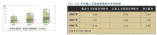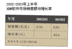 从2000年开始,人力资源管理软件逐渐受到国内媒体的关注,2001年有不少新的投资进入了人力资源管理软件市场,这一年,人力资源管理软件领域出现了十几个新面孔。在2003年,HRM软件成为管理软件市场的热点之一。尽管受到“非典”等不利因素的影响,2003年上半年的HRM软件市场仍达0.81亿元,较前年同期增长44.6%,如表1所示。