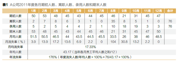 关于报告期的选择,通常可以按照月度、季度和年度来分别统计(月度一般是最小的统计周期),而这里面就涉及到一个如何计算报告期平均人数的问题。按照国家统计局的规定,当月的平均人数以月初和月末人数的平均值为准,年度员工平均人数为同年连续12个月的各月员工平均人数之和除以12,但是这样计算年均人数,可能就会出现计算出的员工流失率大于100%的情况。比如A公司2011年度员工的流动情况如表1所示,按这种算法,A公司的年度员工流失率为176%。