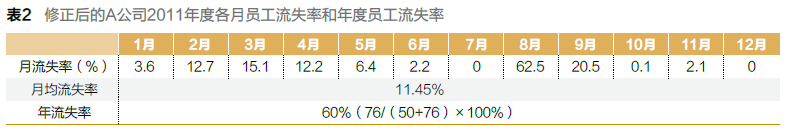按照修正后的计算方式,上例中A企业2011年度的各月度员工流失率和全年总的员工流失率如表2所示。