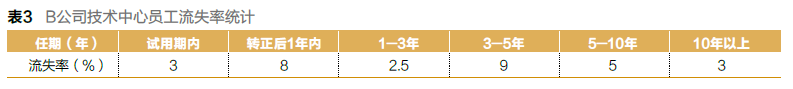 比如,以B公司技术中心为例,其员工任期流失率统计如表3所示: