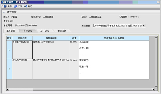 e-HR系统中,可以建立从目标制定、目标分解下达、与目标关联的工作计划制定、业务完成数据管理、绩效过程反馈、绩效总结、绩效评估、绩效等级分布、绩效面谈、绩效申诉、绩效结果应用等一系列的绩效管理流程,将绩效管理体系移植到信息管理系统中,实现具体、可操作管理。