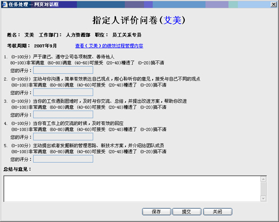定期的绩效总结回顾并制订绩效改进计划,是绩效管理中促进绩效改善的重要手段。在e-HR系统中,员工可以直接输入工作总结或目标总结。上级可以查看到员工的总结,并且可以在员工的总结中,对员工的绩效添加改进建议,实现绩效互动沟通。