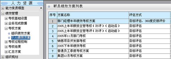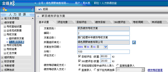 例如,在金蝶K/3 HR系统的"个人绩效方案"设置功能中,就包括了方案基本规则设置、本方案评估对象(被考核人)、目标评估(下达和流程)、绩效目标(内容)、360度评估设置、考核周期设置、(结果)申诉流程等项方案设置功能。