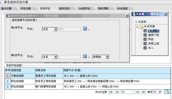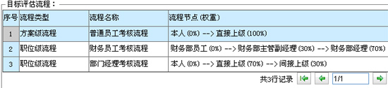 在HR系统设置的每个绩效方案中,可以为不同的被考核人设置不同的考核流程,例如典型绩效考核流程有:"本人总结、自评"――> "直接上级评价" ,"部门经理"――> "主管副总"――>"总经理" "直接上级"――>"部门经理"――>"人力资源部审核"