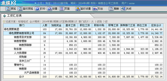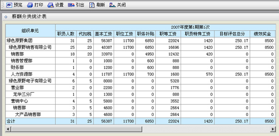 通过薪酬发放汇总表,可以选择统计的起止期间,可以选择展开的部门级数,对人数及各项工资进行汇总统计,从而可以对比分析各部门的工资发放情况。