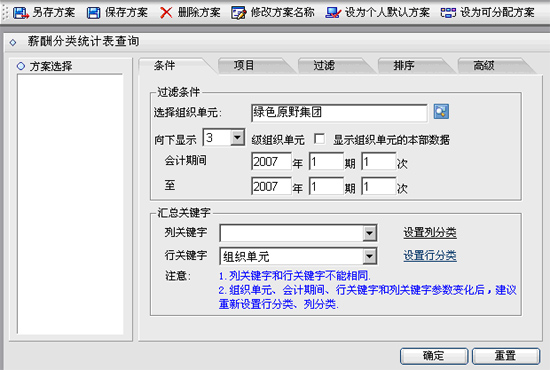 企业对薪酬报表的需要有非常多的个性化,金蝶K/3HR系统能够提供灵活的个性报表设置功能,以满足不同的个性需求。例如以下的自定义综合分类统计表,可以在条件页签中设置组织单元,以及包含的下级组织单元层数,起始会计期间、截止会计期间,列或行汇总关键字。