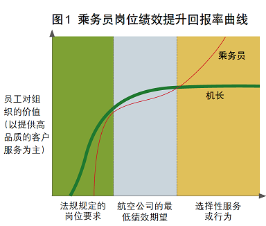 右边曲线迅速上扬,是因为乘客飞行体验的60%〜90%时间都是与乘务员共同度过,乘务员在塑造航空公司的品牌形象、保证乘客安全旅行等方面起到了核心的作用,对航空公司的经济收益也起到关键的作用。很多航空公司都努力利用乘务员创造更多收益机会(在飞机上出售食品、免税商品等)。航空公司从乘务员队伍的投入中能获得巨大的收益,所以会尽可能地鼓励他们提高绩效。
