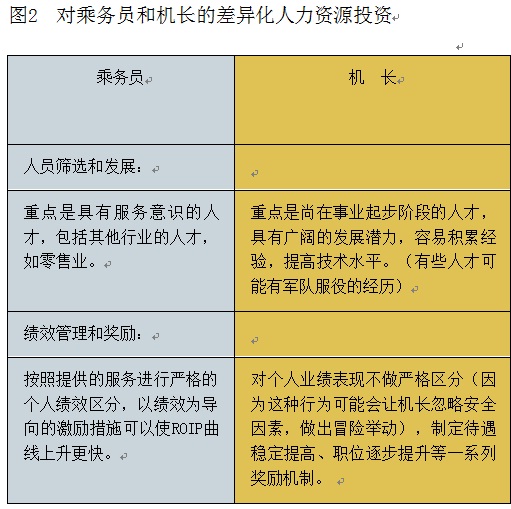 从乘务员和机长的ROIP曲线中,能清晰地看出这两类岗位绩效提升分别能为公司创造附加价值的程度,相应地在人力资源管理中也要进行差异化投入。