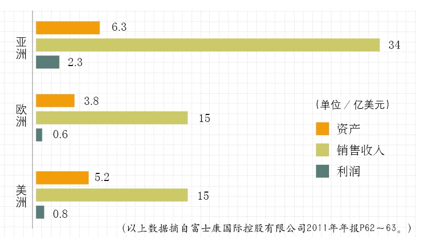 很显然,富士康的资产(主要为厂房、设备、原料等)主要集中在亚洲(即中国)、欧洲和美洲,我们只要简单做一个对比就会发现,这些资产的收益率是不一样的,按照资产的收益率来看,从高到低依次是亚洲、欧洲和美洲。考虑到富士康的120万员工,有将近100万都在中国大陆,当亚洲的资产收益率最高的时候,我们显然有理由认为便宜的劳动力是其在这一地区收益也即利润最高的重要原因;而当欧洲和美洲用总共才20万的劳动力(相差约10倍)即创造出和亚洲地区仅一倍之差的收益时,我们也有理由认为,这些地区的富士康工厂,绝对是自动化程度极高。而之所以这些地区工厂的自动化程度高,是因为其劳动力成本更高,花钱雇人不如花钱买机器人,或者花钱引进更先进的自动化生产线。