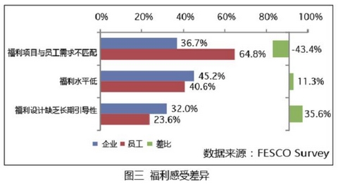 除福利项目与员工需求的匹配程度外,另外一个问题是福利体系的引导性问题。福利并不完全是保健性因素,同样可以具备激励功能,特别是针对那些有晋升意愿的员工。如图三所示,这一点员工关注度还比较低,只有23.6%提出了这一问题,企业HR的感受更强一些,也只有32%的人提到。目前企业一般会针对不同职级制定不同的福利水平,引导员工向上晋升,但是毕竟能够晋升的是少数员工,福利的激励作用同样可以从高绩效员工、老员工保留、新员工奖励不同角度出发进行设计,给不同群体的员工带来不同的薪酬激励效果。