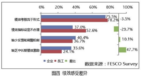 但在绩效指标制定方面,企业HR和员工的感受差异巨大(如图四所示),52.6%的员工认为绩效指标制定不合理,只有37%的HR这样认为。企业实际运营过程中,绩效指标往往是高层制定,由上往下层层分解,很少有从下往上反馈的过程,绩效指标员工讨价还价的余地很小,最终只能接受,但员工并不会从心里认为这样的绩效指标是合理的。
