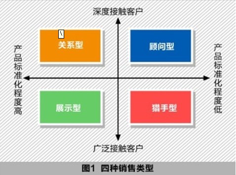 我们从产品(服务)使用的难易程度和与客户接触的深浅程度两个角度,可以将所有的销售归为四种类型:猎手型、顾问型、关系型、展示型(如图1)。