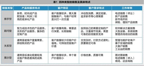 这四种类型的销售覆盖了绝大部分的销售领域。不同的销售类型意味着需要不同的销售模式和销售人员,只有基于对产品和服务销售类型的正确认识,并采取相匹配的销售模式和销售队伍,才能在业务拓展上事半功倍(如表1)。否则就会出现销售费用、人员流失率居高不下的局面。
