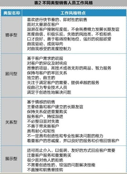 从表2中我们看到不同类型的销售对销售人员的风格有独特的要求。只有采用相对应的销售风格才能与销售的产品服务类型实现匹配。我们可以想象,一个喜欢快节奏、即时就能达成销售的猎手型业务员,如何能够花费大量时间泡在一个客户身上、花费几年的功夫去实现一笔顾问型的订单?同样,当一个对客户反应极为敏感的关系型业务员去沿街销售一个保险产品时,大量的粗暴拒绝在几天之内就会让他被极大的挫败感压垮,最终落荒而逃。