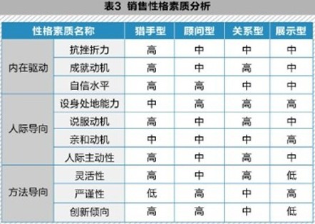 表3是对各类型销售人员特征的进一步分析,从表中我们可以清晰地看出不同类型销售对素质要求的差异,这样就让我们在甄选业务员的时候能够心中有数,根据自身企业需要来匹配适合的销售人员。