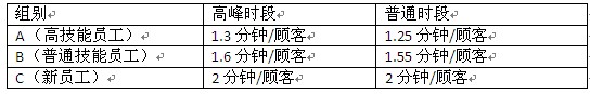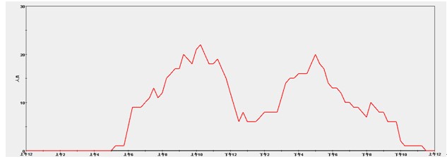 总顾客数在一天之内不是均匀 分布的,如果按15分钟间隔,可以估算出不同时间段所需的人员数。可以看出,上午8点到11点半是一个高峰期,下午3点半到6点又是另一个高峰期,这两个 时期需要的收银员最多。另外一张图看起来更形象,体现了一天之内从开店到闭店的人工需求变化(双峰型):
